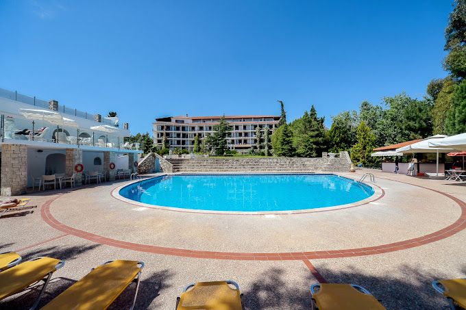 The hotel’s closeness to beautiful beaches, such as those on the Kassandra Peninsula, allows guests to enjoy the crystal-clear waters of the Aegean Sea. In addition to the adjacent beach, the area has picturesque hiking trails, historical monuments, and small villages to visit, making it a great place for both leisure and adventure.