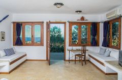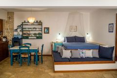Villa ILIATORAS is built in a hill just above the beach of ‘Mononafti’ in the area of Agia Pelagia, in a big extent surrounded with trees and flowers. It generally offers unique view and is a very romantic and quiet place for holidays nearby the sea. It is constituted by five independent residences. The four are in the ground floor, two apartments and two studios and in the upper floor is located our suite. All the residences have amazing view in the sea and in the around hills. The architecture of ILIATORAS, the furnishing and generally the configuration of the exterior and internal spaces are distinguished for their personal element and their perseverance in the detail and this is what makes ILIATORAS villa distinguish from the formal hotel. During your stay in ILIATORAS you have the sense that you were entertained in a friendly house in Crete with all your comforts.